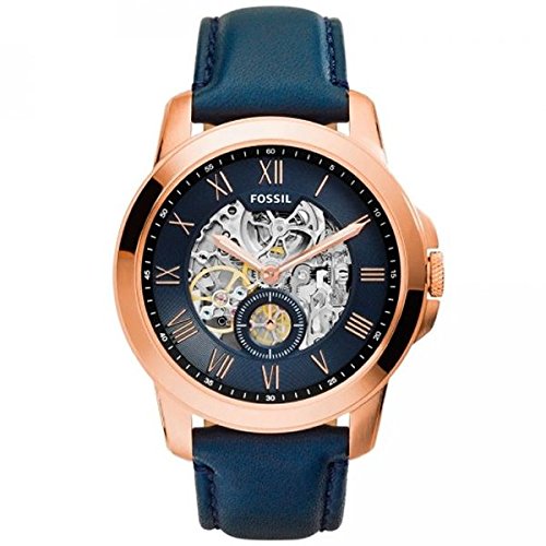 This attractive men's Fossil Grant watch has a PVD rose plating case and is fitted with an automatic movement. It is fitted with a blue leather strap and has a skeleton dial.