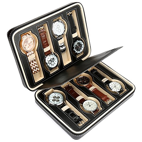 Best Seller! H&S 8 Watch Jewellery Display Storage Travel Box Case Organiser Black Faux Leather Mens Womens Ladies Review
