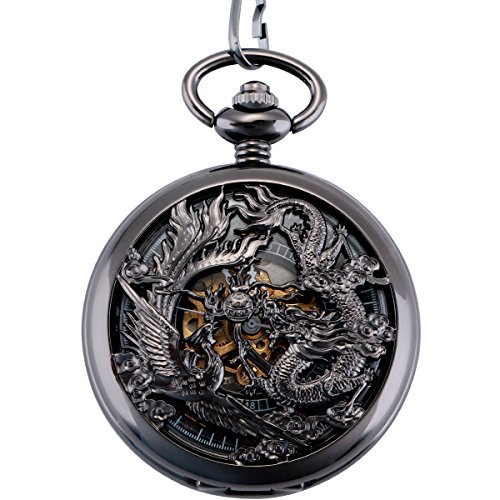 Best Seller! ManChDa® Antique Mechanical Pocket Watch Lucky Dragon & Phoenix (best wishes) Black Skeleton Dial with Chain + Gift Box Review